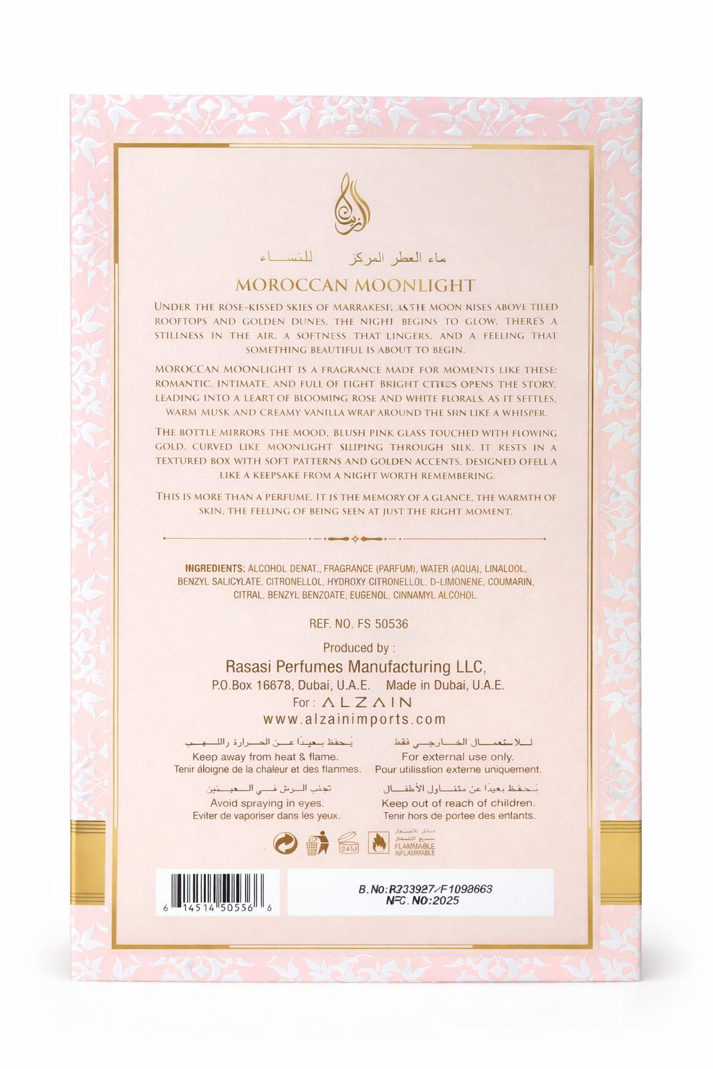 Moroccan Moonlight captures the romantic elegance of floral femininity. It opens with soft vanilla and powdery rose, blended with fruity sweetness and delicate florals. Fresh iris and musk create a smooth, comforting base, while hints of amber add warmth. A graceful fragrance perfect for both daytime charm and evening sophistication.