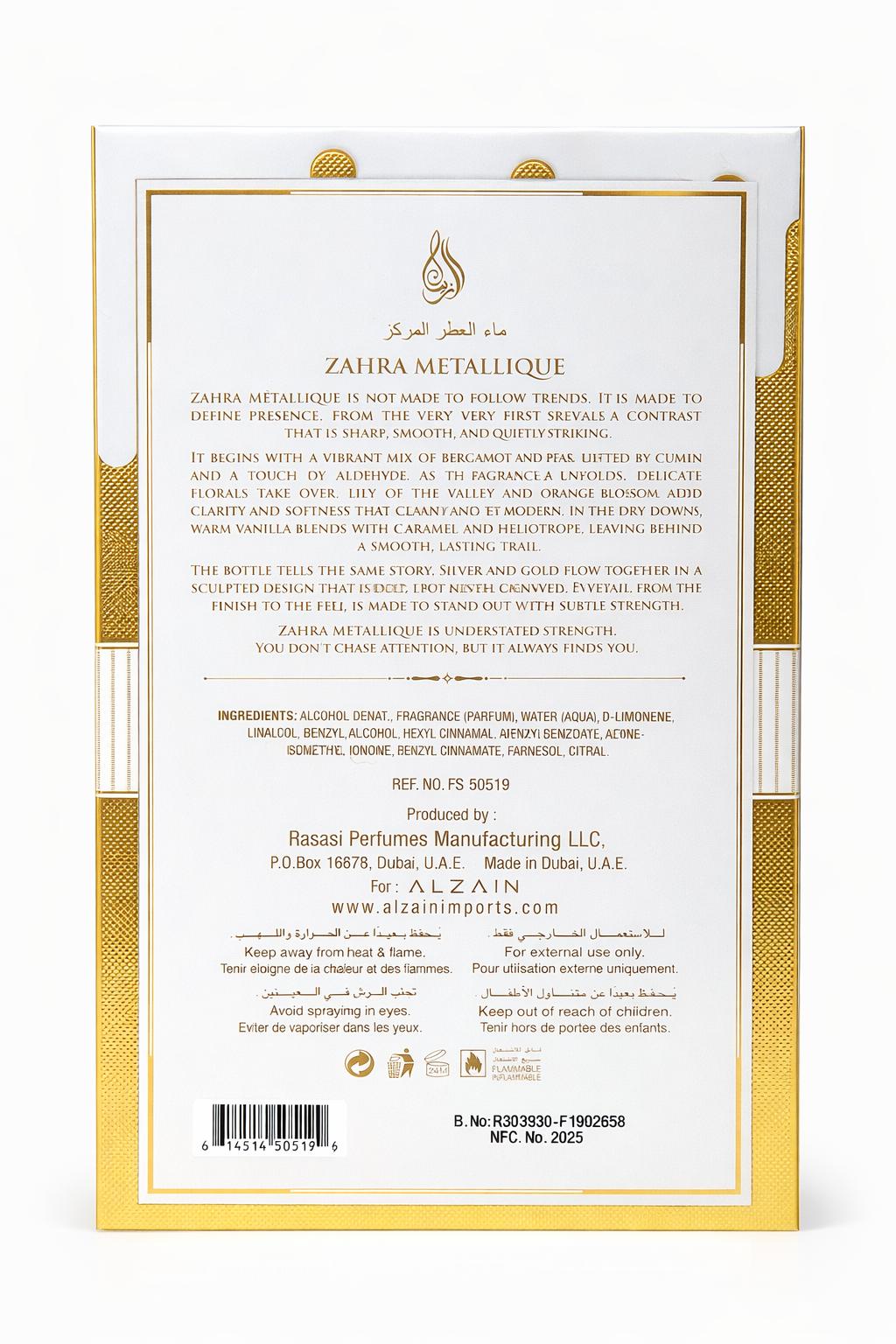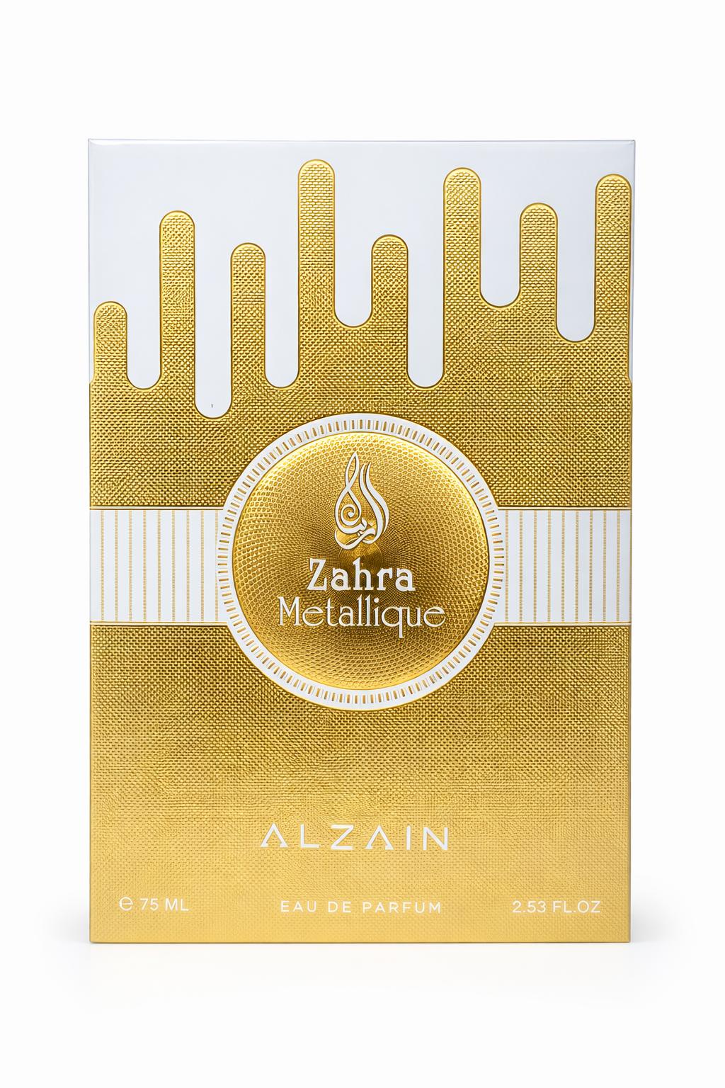 Zahra Metallique opens with a bright, aldehydic sparkle wrapped in soft vanilla. Its creamy, powdery floral heart adds elegance and refinement, while subtle woody and musky undertones bring warmth and sophistication. Sweet, fresh, and delicately balsamic, this fragrance delivers a modern metallic shine balanced with soft sensuality. Perfect for those who enjoy clean luxury with a touch of sweetness.